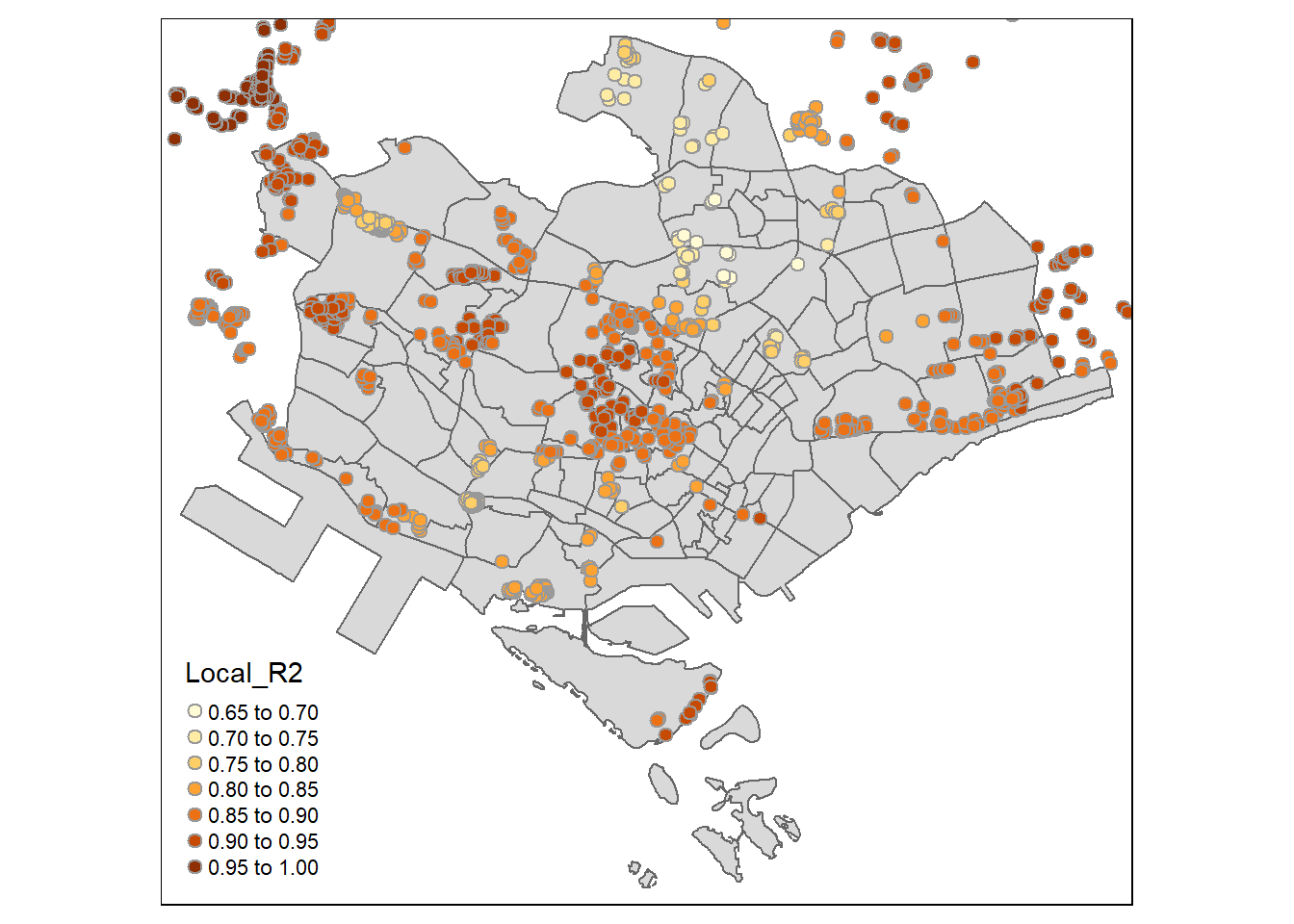 summary(gwr.adaptive$SDF$yhat) Min. 1st Qu. Median Mean 3rd Qu. Max.